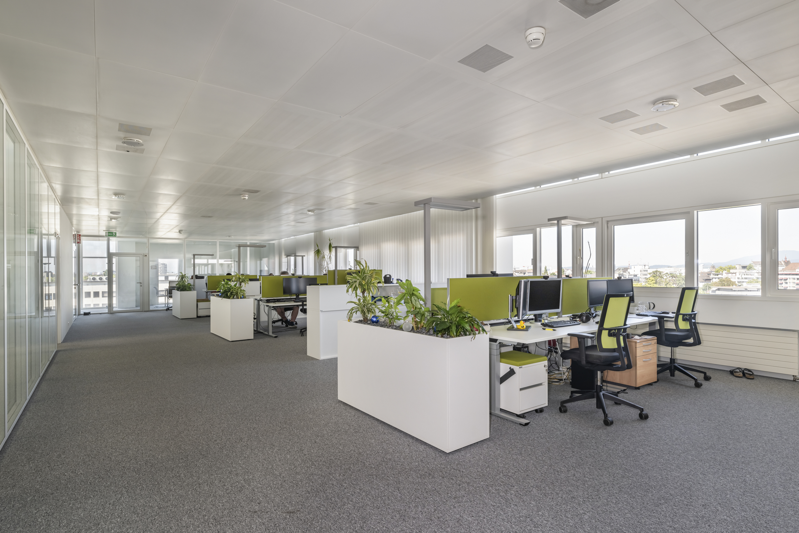Sie finden hier hochwertige Arbeitsplatzqualität mit hellen Büros und angenehmem Raumklima und einer schönen Aussicht über die Stadt Basel.