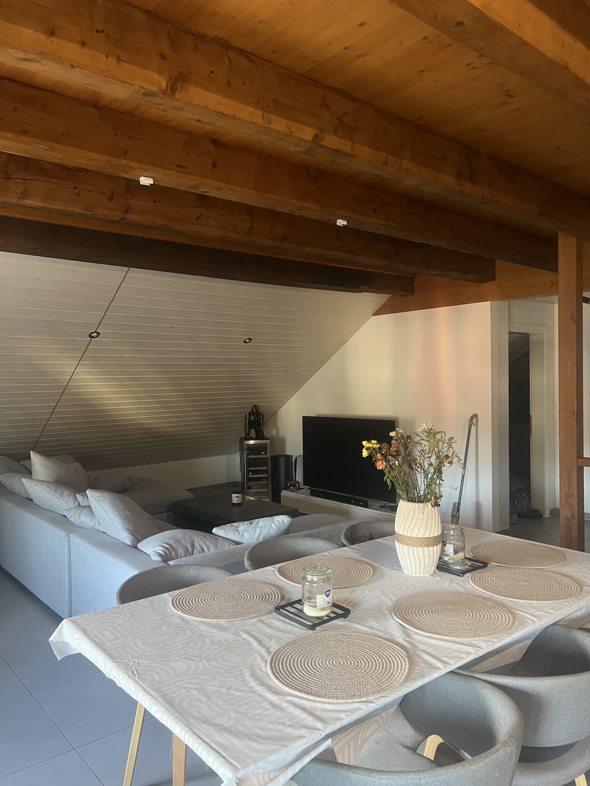 Les poutres apparentes lui donnent un cachet évident et les différents espaces disponibles permettent de s’organiser selon ses envies.