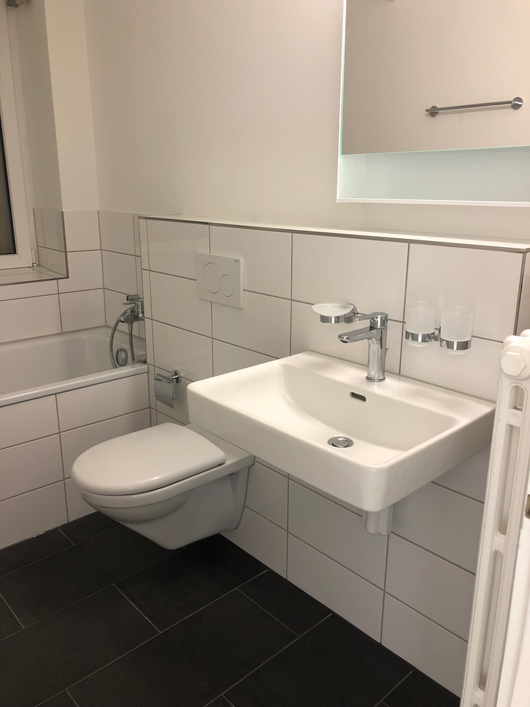 – Badezimmer mit Badewanne, Lavabo, WC und Einbauschrank
