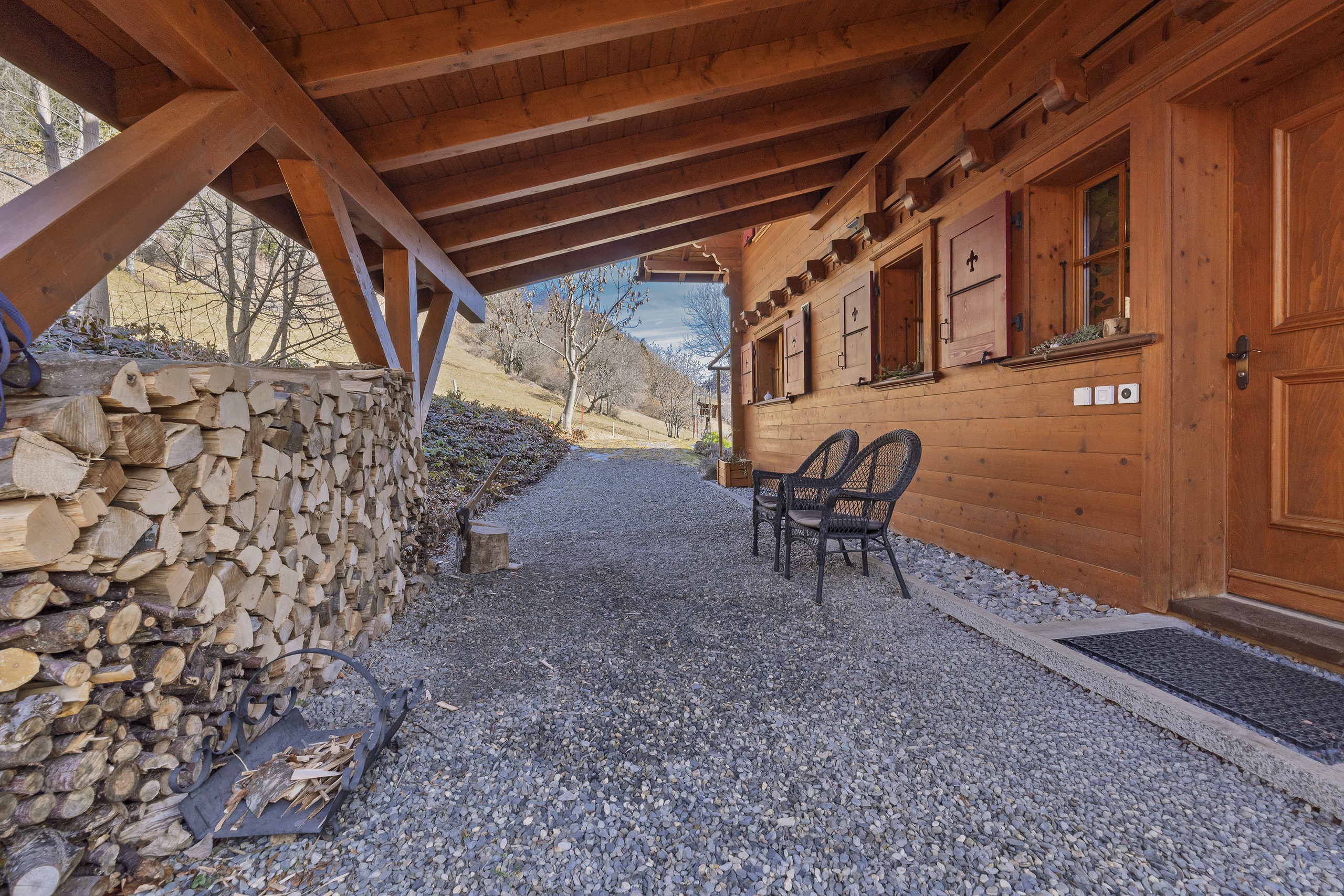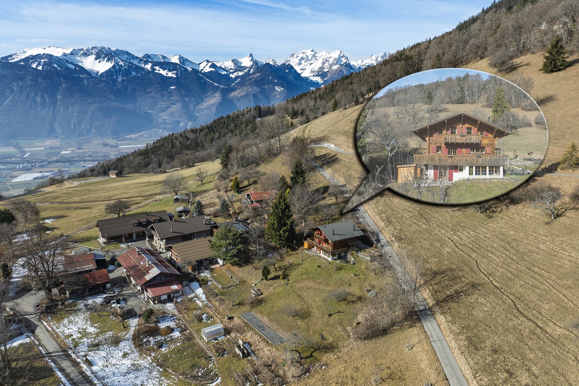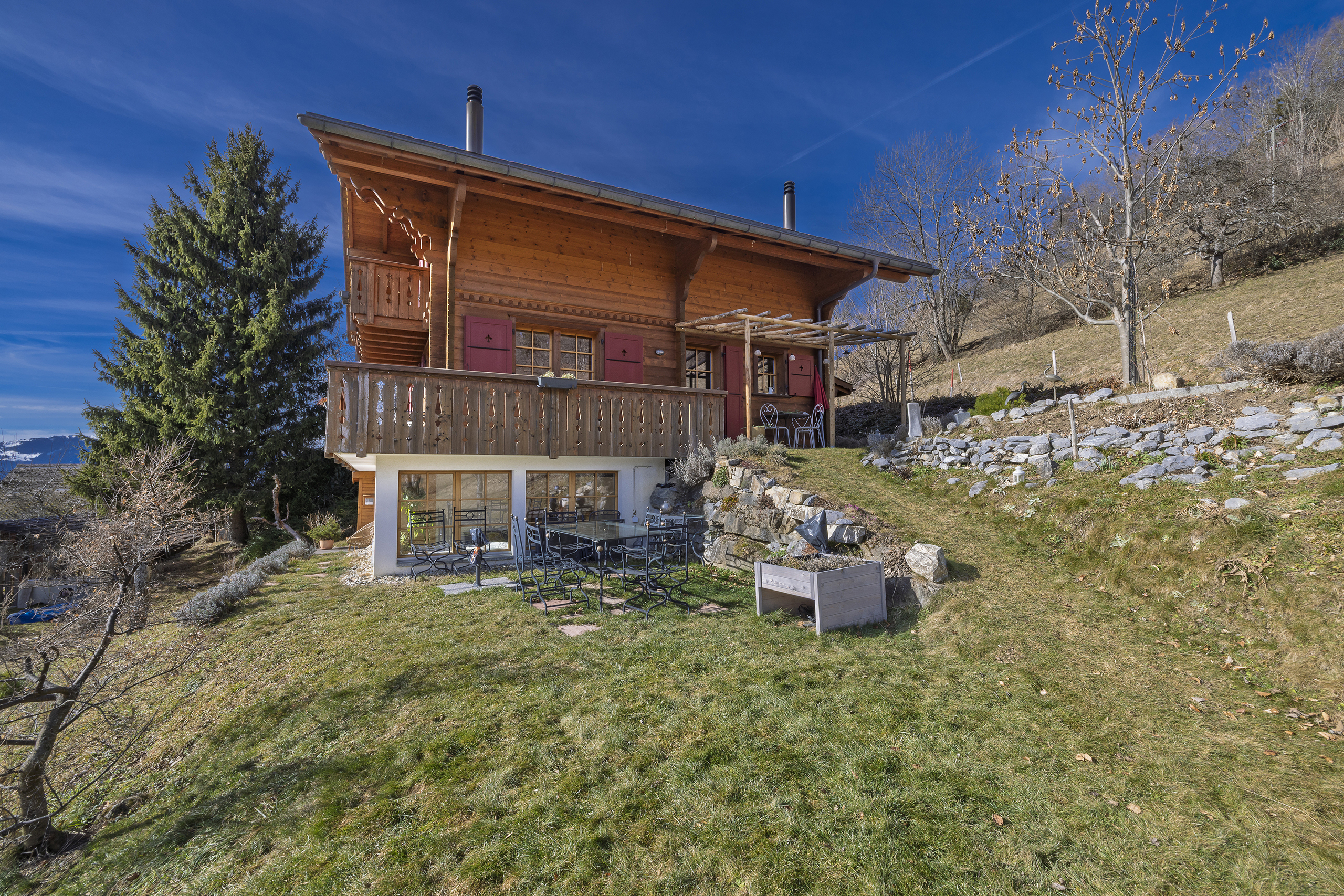 Niché à 1000m d’altitude et entouré d’un verger, le chalet est situé au milieu d’un écrin de verdure dans le petit hameau de Veyges, tout proche de Leysin. Il offre ainsi une vue magnifique sur les montagnes et les champs avoisinants sans oublier le cadre chaleureux et une ambiance champêtre.