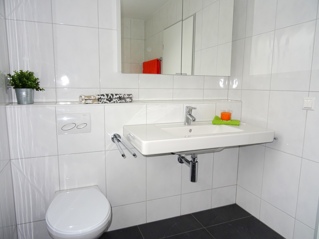 - Badezimmer mit Lavabo, WC, Badewanne, keramische Bodenplatten
