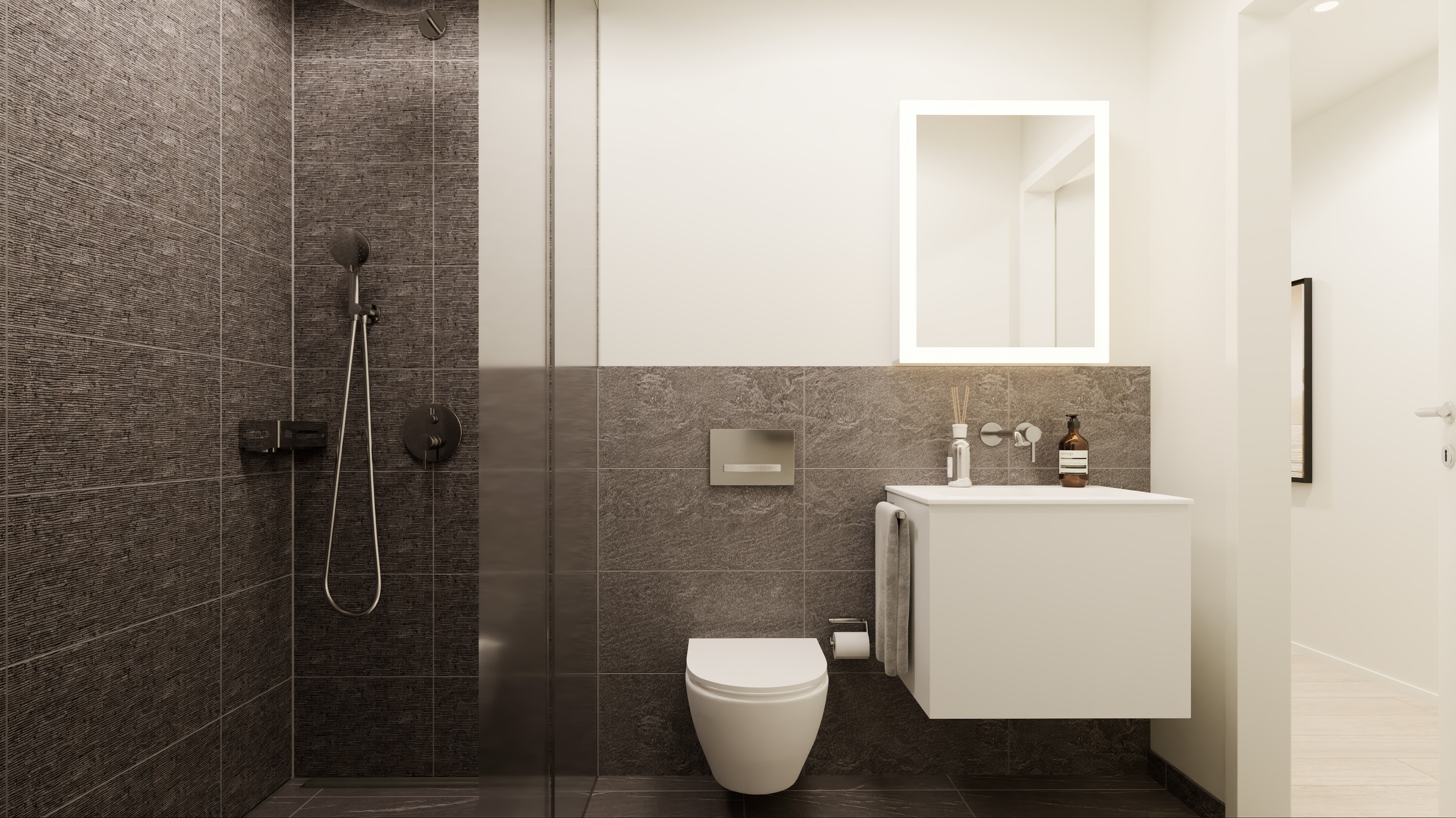 - Das zweite Badezimmer mit Dusche und Toilette liegt ebenfalls im Eingangsbereich, perfekt auch als Gästetoilette