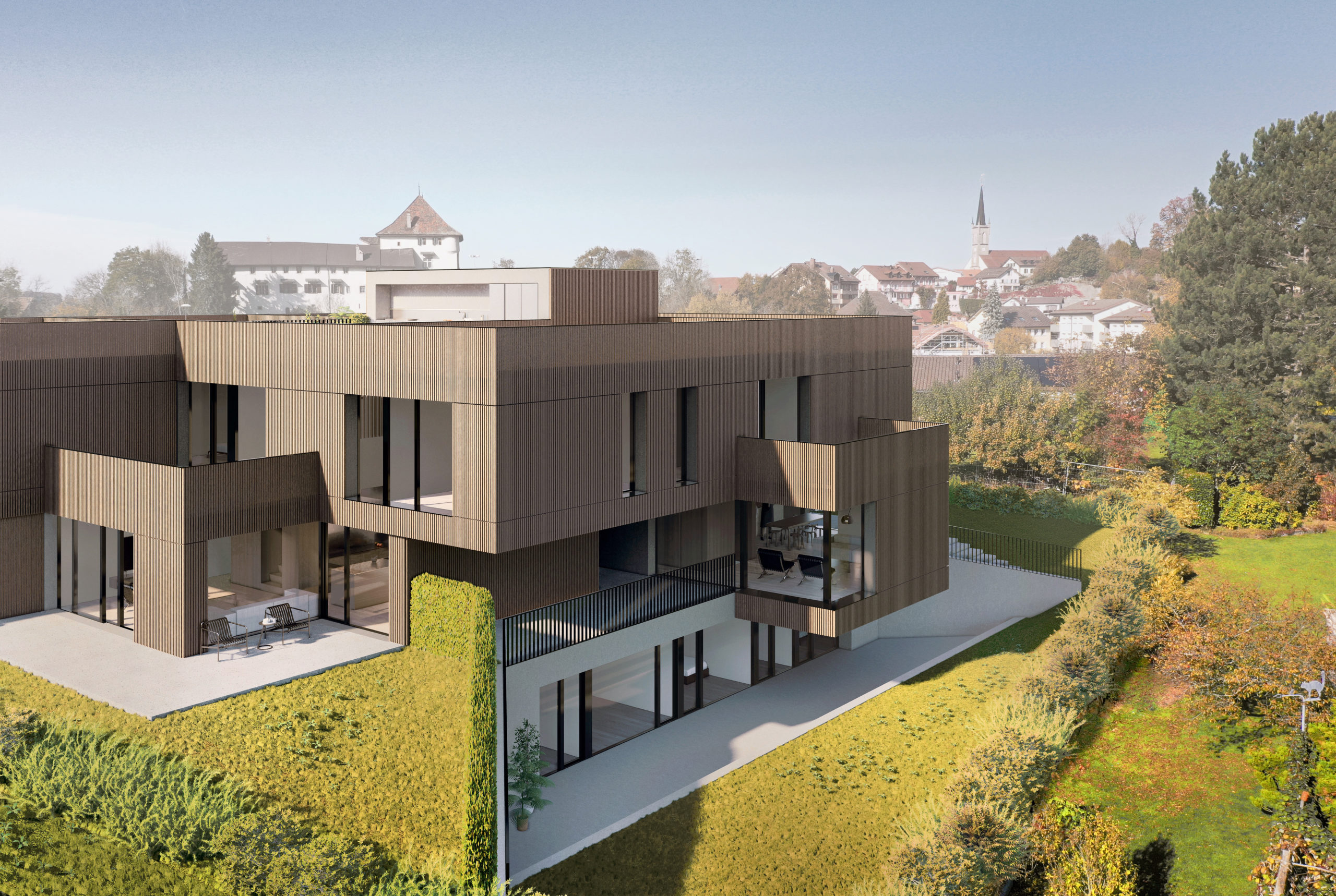 - Place de parc extérieure optionnelle en sus : CHF 10’000.– (selon disponibilité)