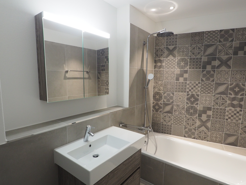 – Badezimmer mit Dusche, WC und Lavabo mit Unterbau