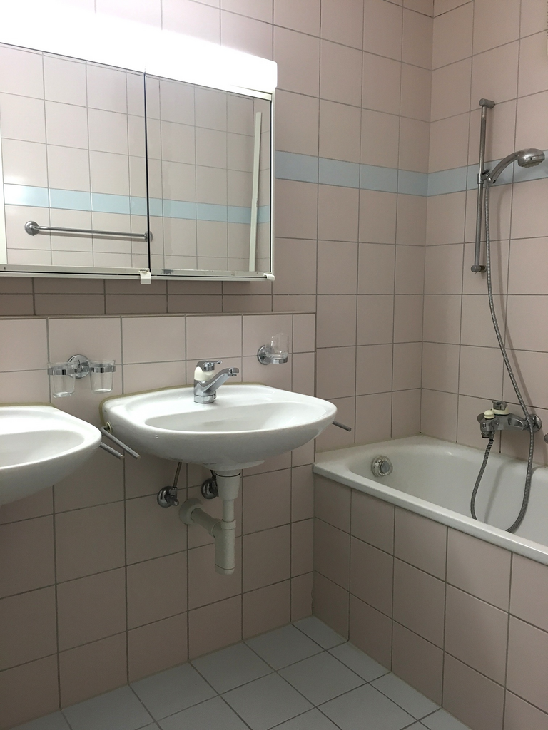 Das Badezimmer bietet mit Badewanne und Doppellavabo viel Platz für den Alltag. Ein zusätzliches WC sorgt für weiteren Komfort.