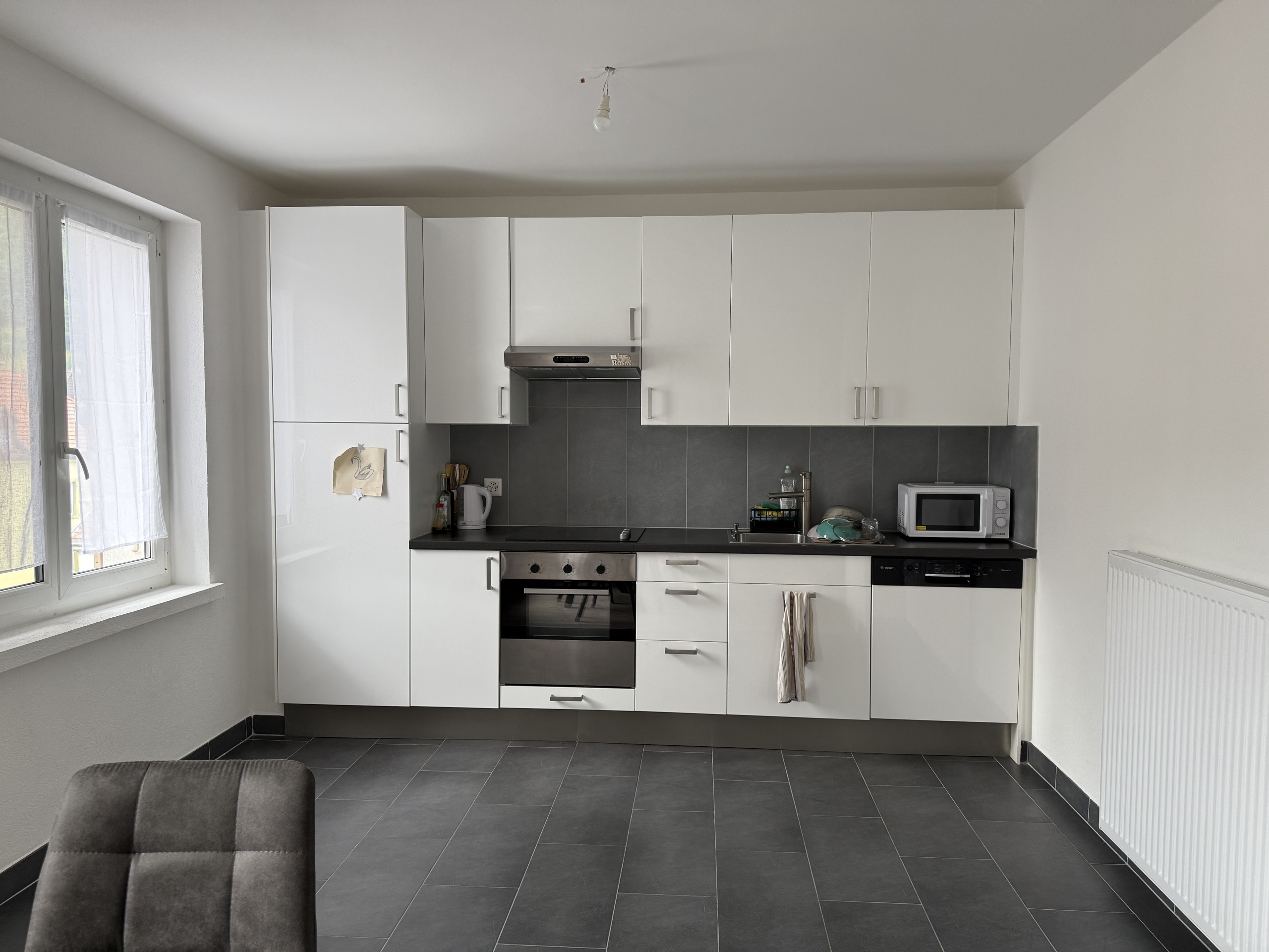 Bel appartement lumineux de 2,5 pièces, rénové, situé au 3ème étage dans un immeuble sans ascenseur. Il est composé d’une cuisine équipée avec une machine à laver et sécher ouverte sur un vaste séjour, une chambre, une entrée avec des armoires murales ainsi que d’une salle de bains/WC et une cave.