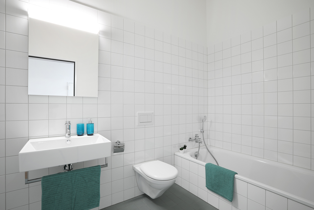 - Badezimmer mit Badewanne / WC / Lavabo und Waschturm
