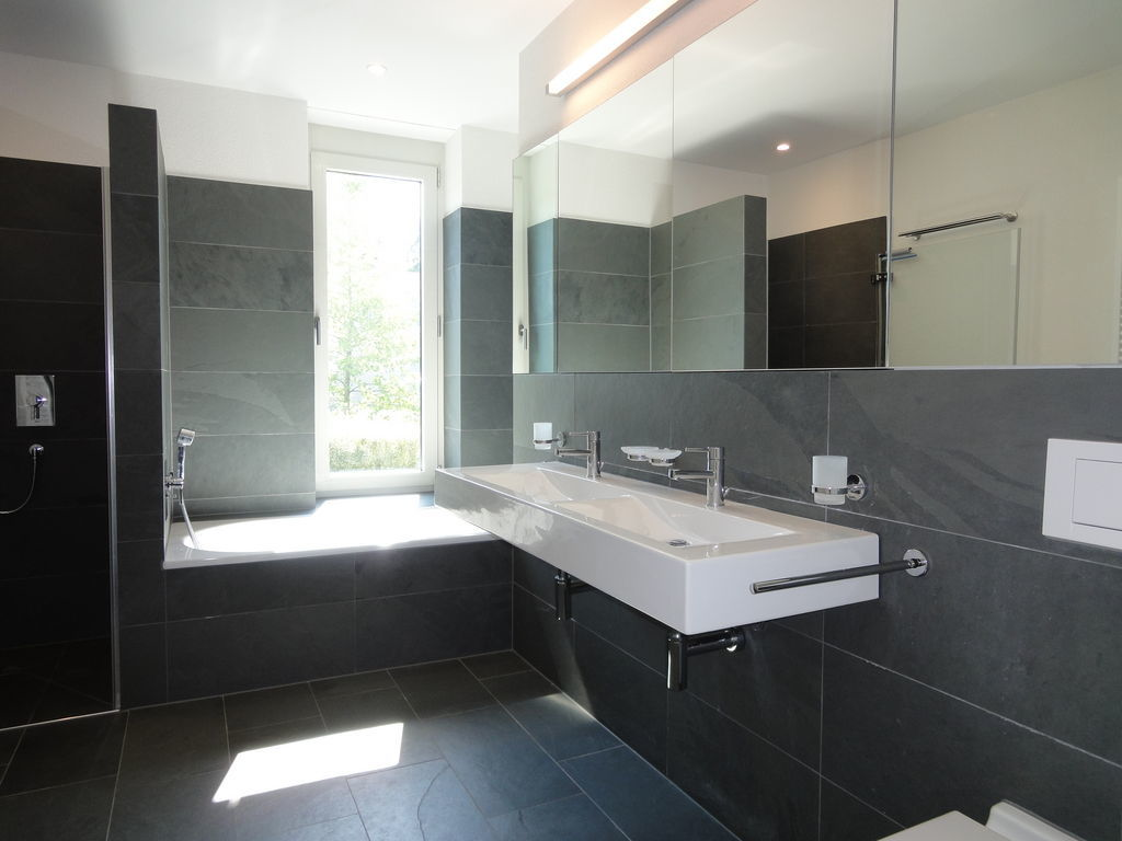 – Ein grosses Badezimmer mit Badewanne und Dusche, Doppellavabo und WC. – Ein separates Gäste-WC mit eigenem Waschturm.
