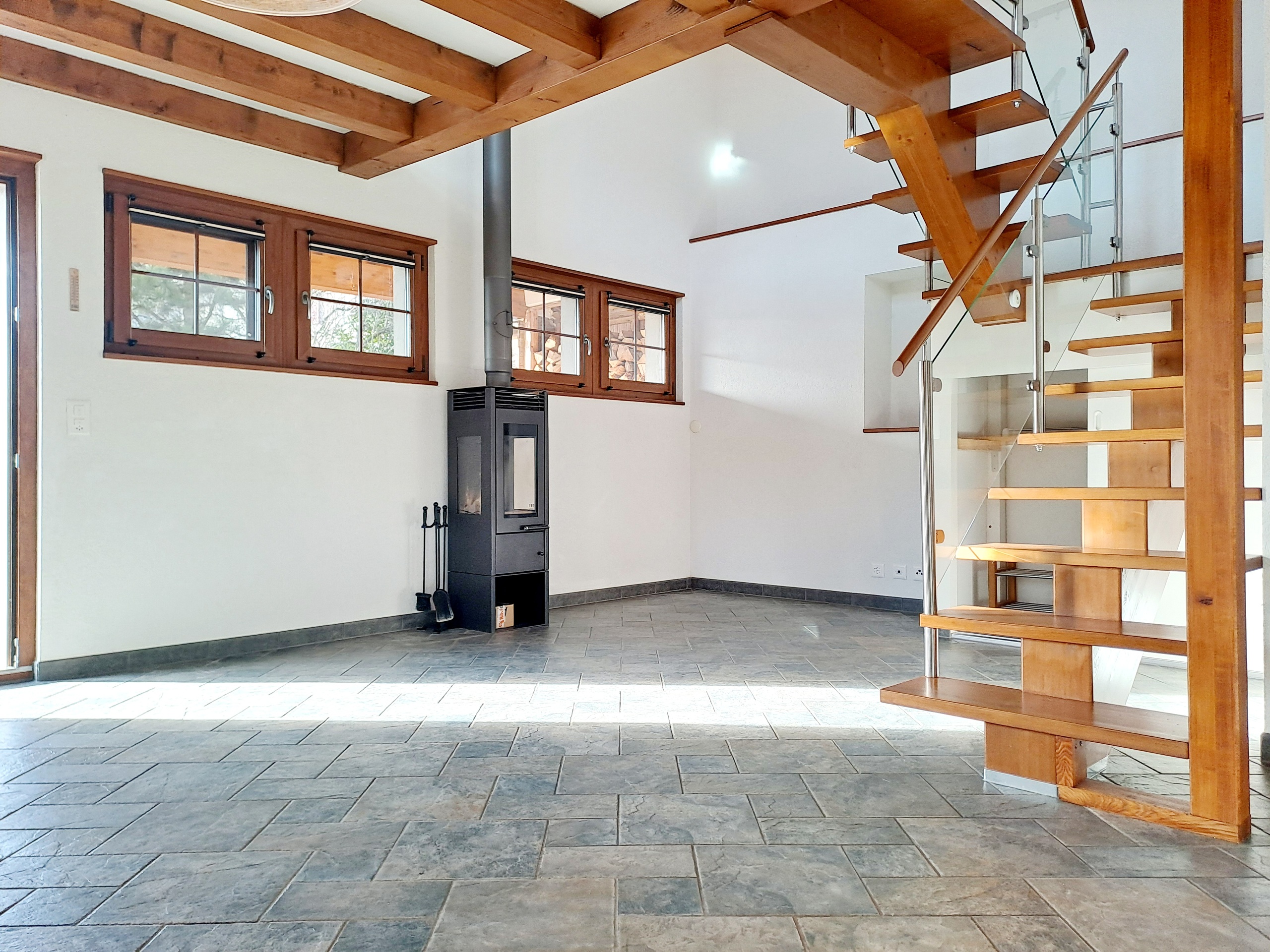 Au rez-de-chaussée hall d’entrée donnant un accès direct au séjour et son poêle suédois, cuisine ouverte et entièrement agencée et son coin repas et 1 salle de douche/WC.