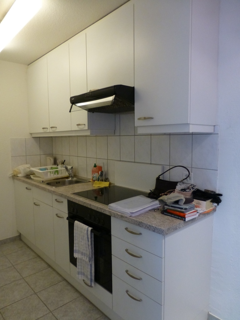 Die Wohnung verfügt über eine grosszügige Einbauküche mit Glaskeramikkochfeld und Kühlschrank, jedoch ohne Geschirrspüler. Das Badezimmer ist mit Badewanne, Spiegelschrank und Toilette ausgestattet. Im Eingangsbereich finden Sie praktische Einbauschränke sowie eine Garderobe. Das Wohnzimmer ist mit einem schönen Parkettboden versehen und bietet direkten Zugang zum Balkon mit Blick ins Grüne