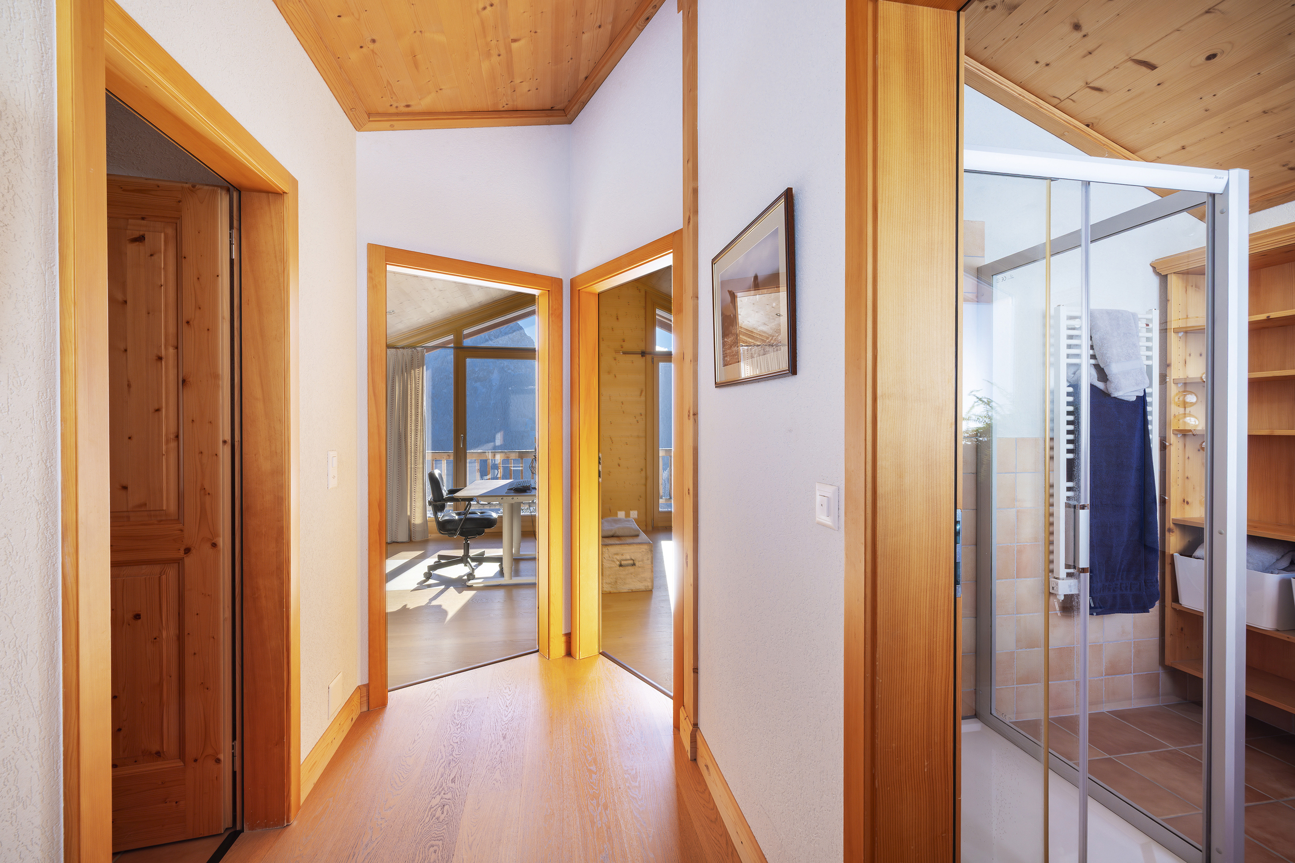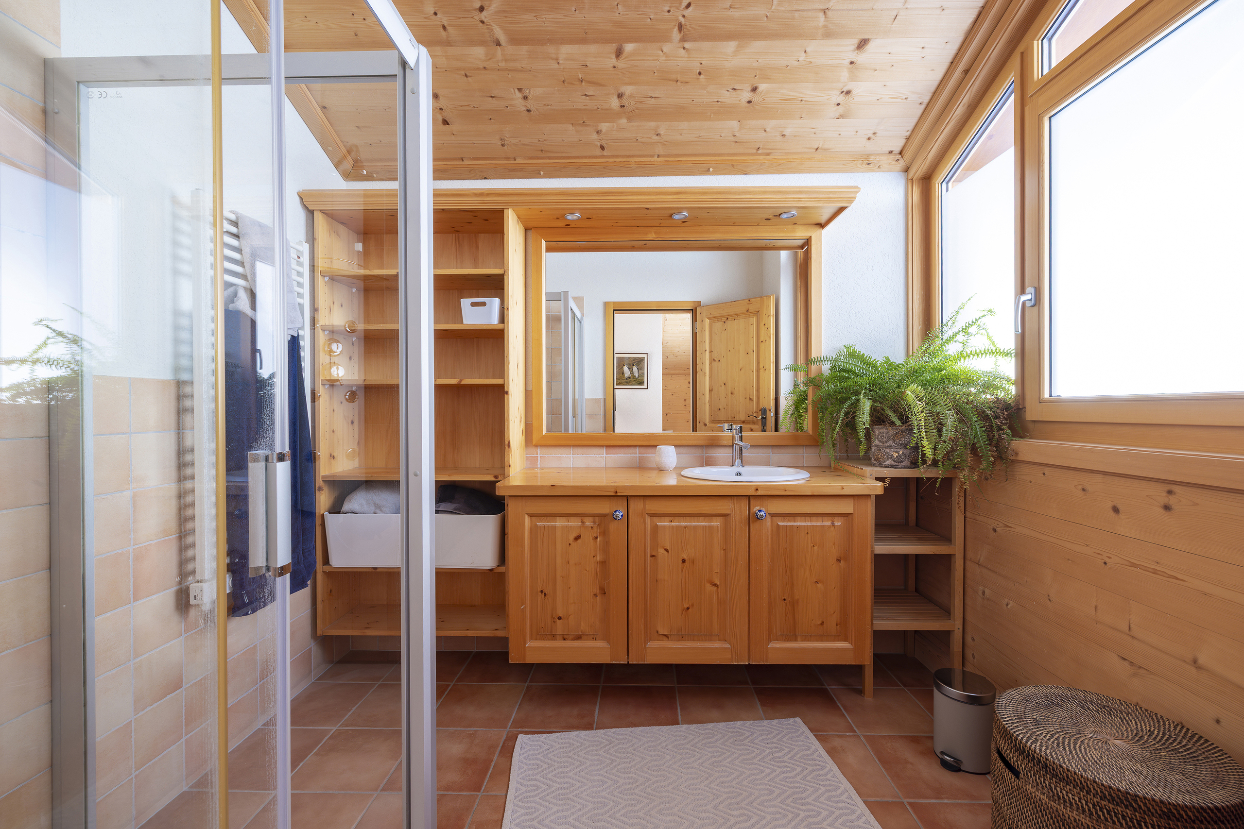Deux belles chambres se trouvent à l’étage dont une avec un dressing attenant et tous les deux avec un accès direct au balcon orienté plein sud. Une salle de douche et un wc séparé sont à disposition à cet étage.