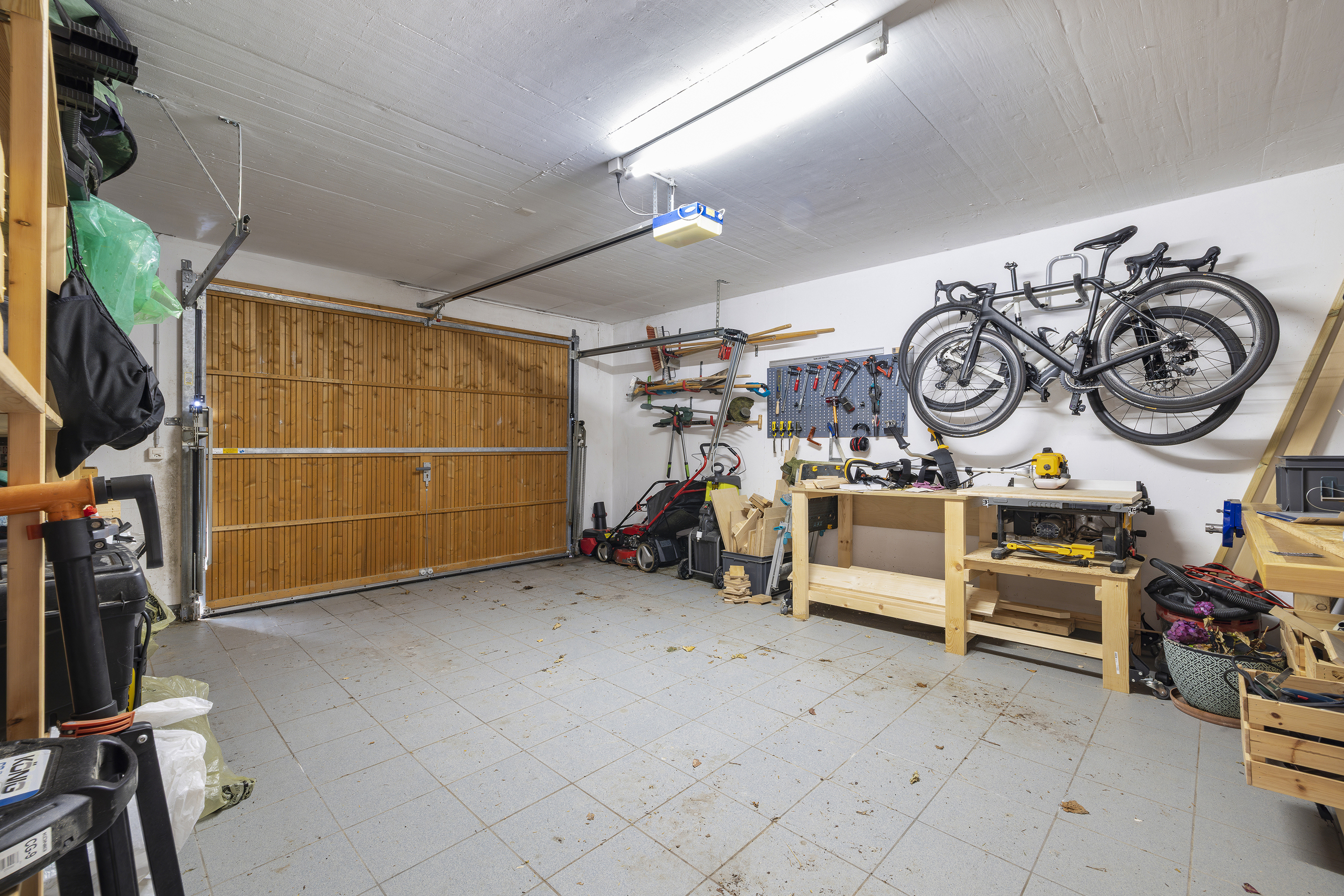 Un garage avec rangements, une grande cave et un local technique équipé d’un lave-linge et d’un séchoir se situent également au rez, le tout entouré par un espace vert reposant et soigné.