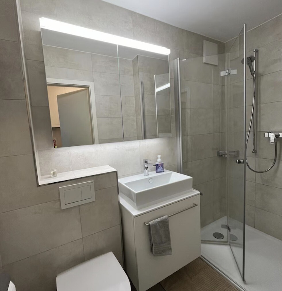 – Modernes Badezimmer – ausgestattet mit komfortabler Dusche mit Glasduschwand, WC, Einzellavabo mit Unterschrank sowie einem Spiegelschrank