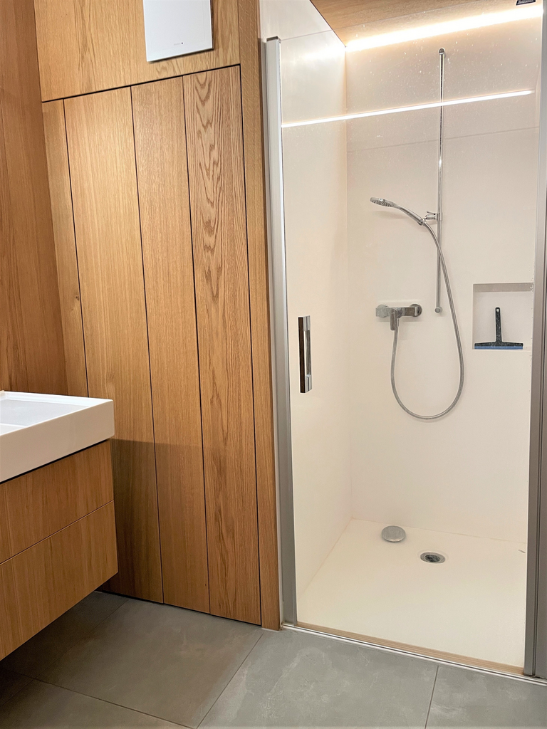 - Badezimmer mit Lavabo, Unterschrank, Dusche und praktischen Einbauschränken