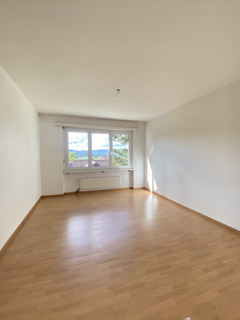- grosszügiges Wohnzimmer mit Laminatboden und Zugang zum gemütlichen Balkon mit Blick ins Grüne