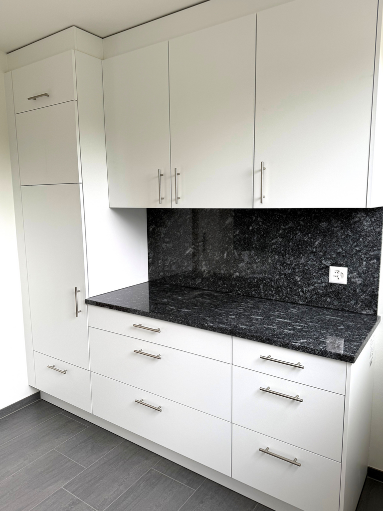 - moderne Küche mit Granitabdeckung, Glaskeramikherd, Geschirrwaschmaschine, Kühlschrank mit sep. Tiefkühlfach und keramischen Bodenplatten