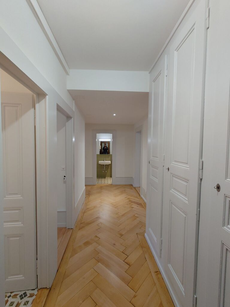 Joli appartement entièrement rénové de 3 pièces d’environ 80 m2 au rez-de-chaussée, offrant une cuisine équipée ouverte sur un grand séjour lumineux, 2 chambres, un hall avec armoires murales, une salle de douche avec installation pour colonne de lavage, un WC séparé et une cave.
