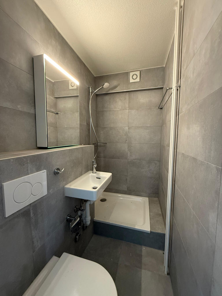 Die Wohnung wird aktuell saniert. Der Boden auf den Fotos wird in der ganzen Wohnung graue Platten (Bild Küche und Bad ersichtlich) haben.