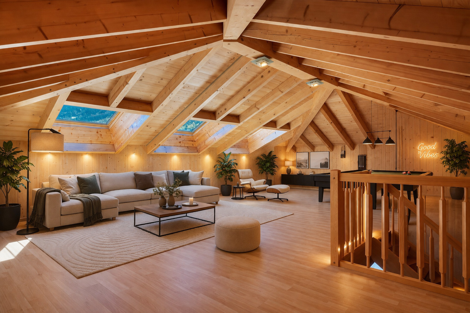 D’une surface habitable d’environ 200 m², la villa séduit par son spacieux séjour baigné de lumière, ses larges ouvertures sur l’extérieur ainsi que sa vue dégagée sur la plaine et les montagnes environnantes. Les combles aménagés, avec leur charpente apparente, offrent un espace chaleureux et généreux, idéal pour une salle de jeux, un espace détente ou la création de chambres supplémentaires selon les besoins.