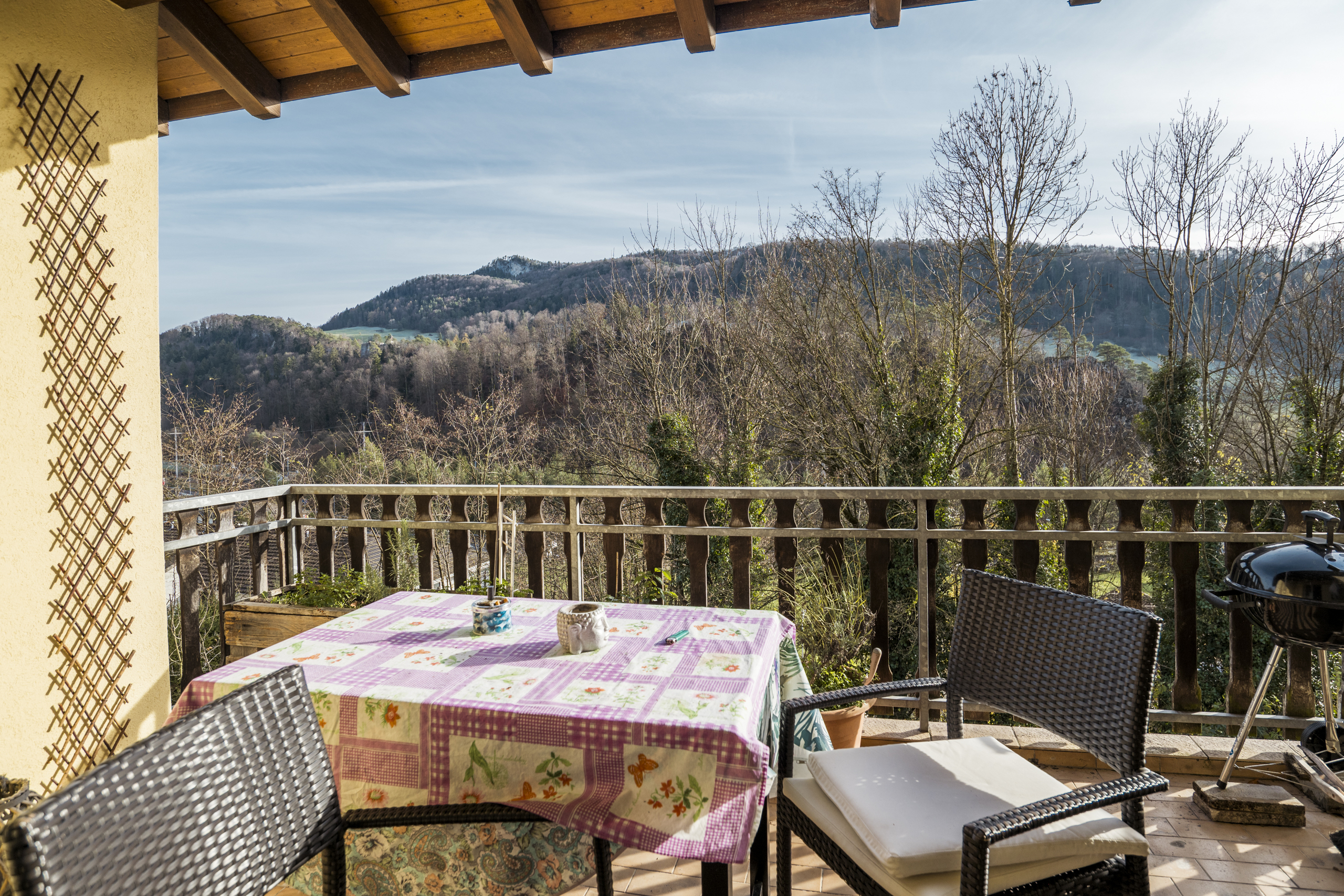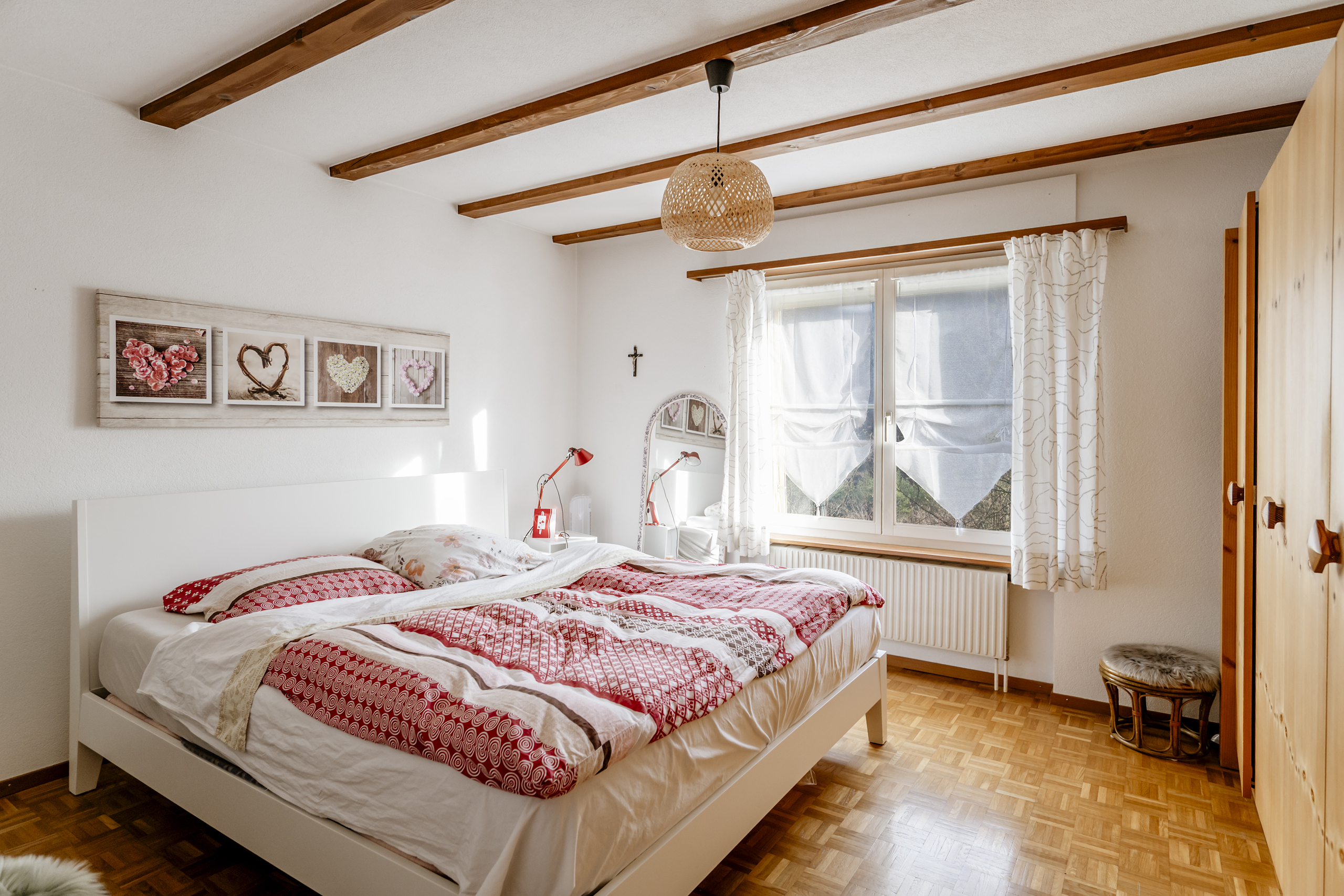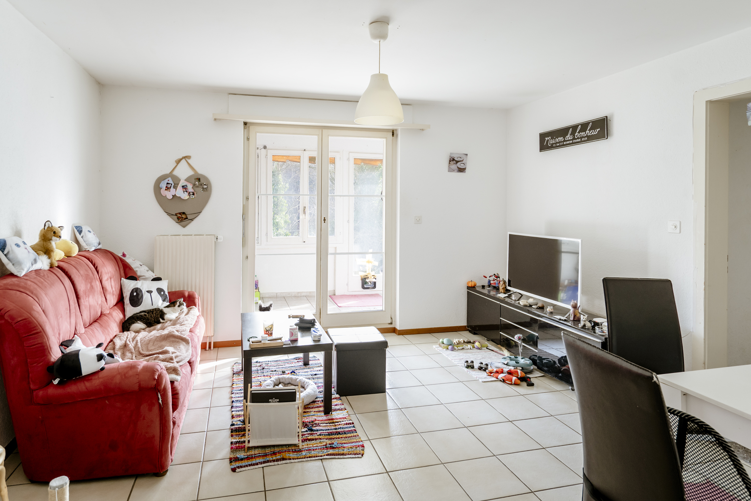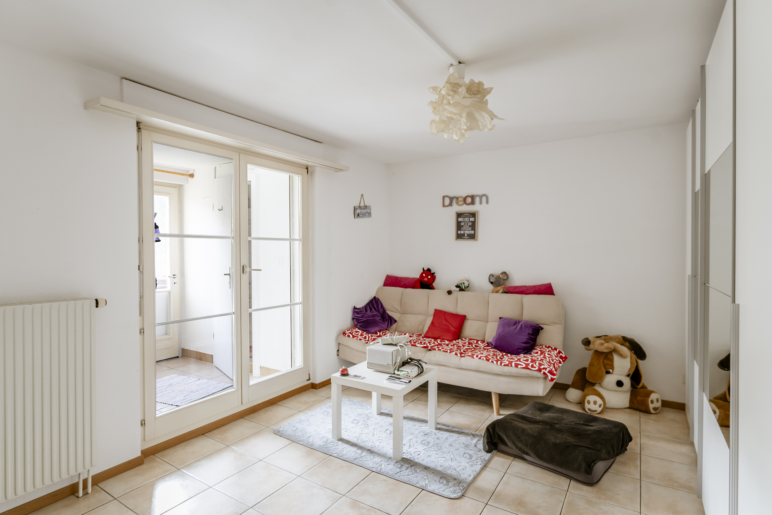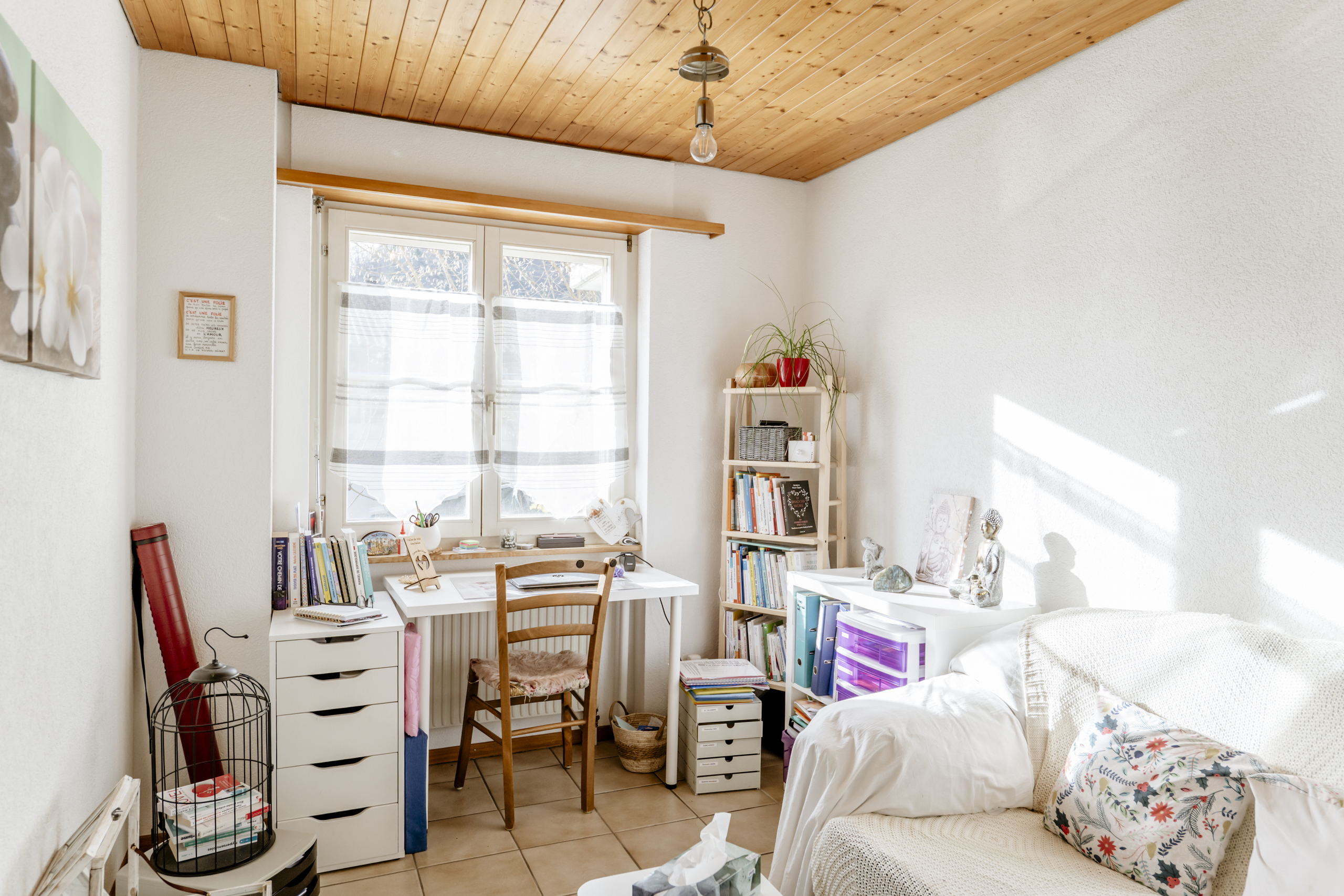 Le rez-de-chaussée supérieur abrite la partie principale du logement. L’entrée, avec armoires murales, s’ouvre sur une première chambre de type bureau. Vient ensuite le salon / salle à manger avec cheminée et sortie sur la terrasse ouest. La cuisine habitable, orientée plein sud, bénéficie d’un large balcon offrant une superbe vue sur le Roc de Courroux.