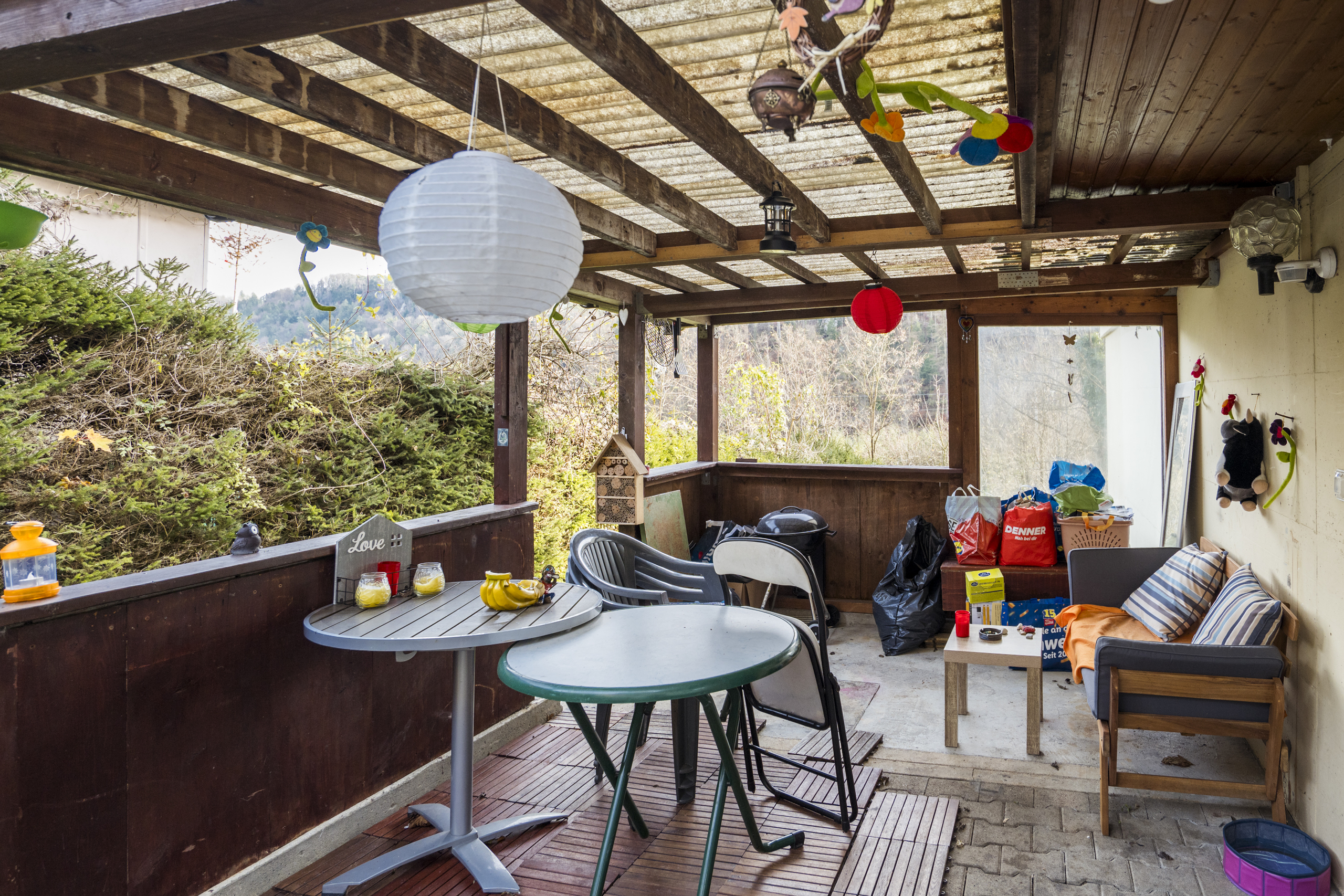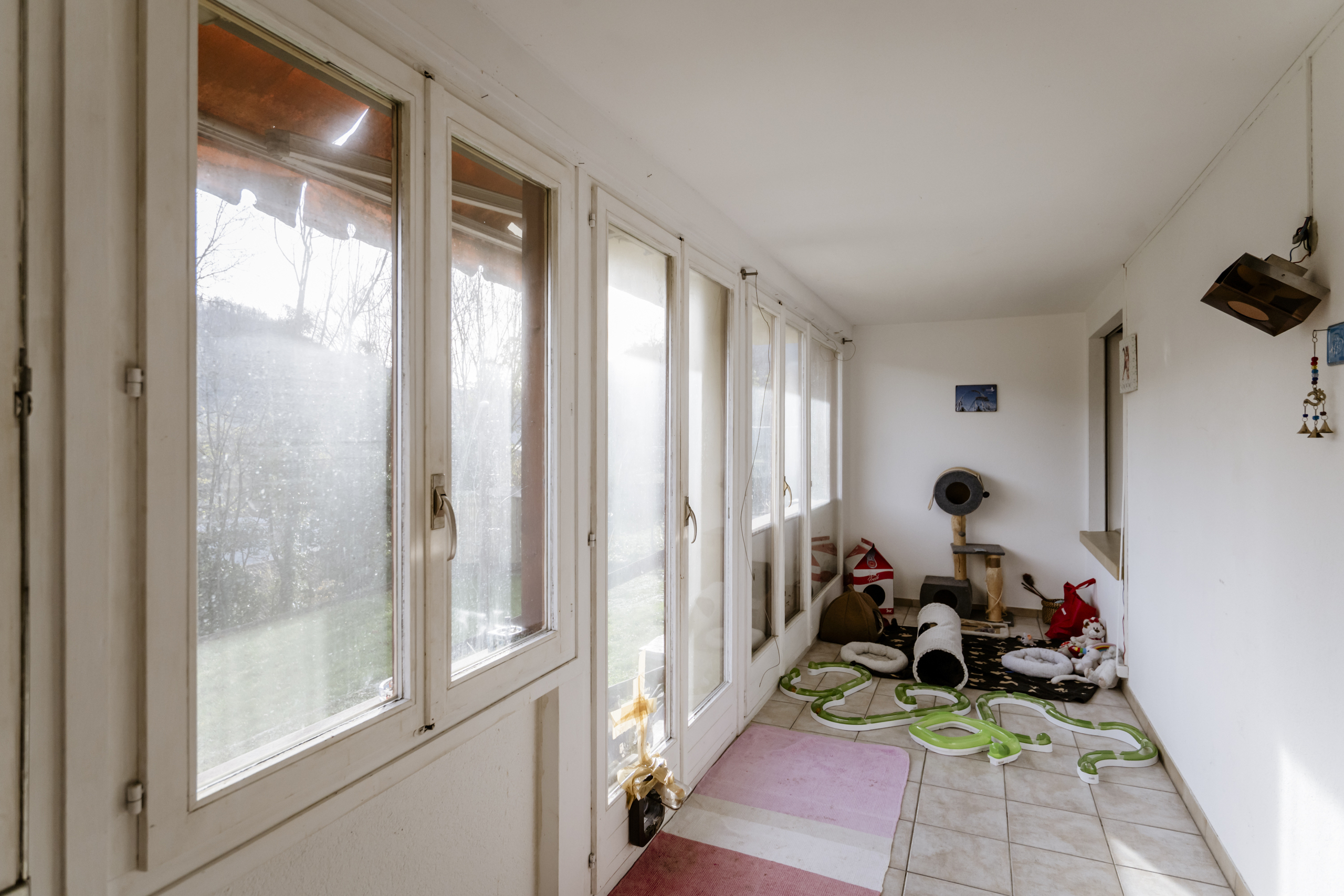 L’autre partie du niveau inférieur abrite un appartement indépendant auquel on accède depuis une agréable terrasse couverte. L’entrée mène à une petite cuisine semi-ouverte, à la salle de douche/WC et au salon donnant sur un grand jardin d’hiver. Depuis le salon, un corridor dessert deux chambres supplémentaires, dont l’une est prolongée par un second jardin d’hiver avec une salle de bain / WC.
