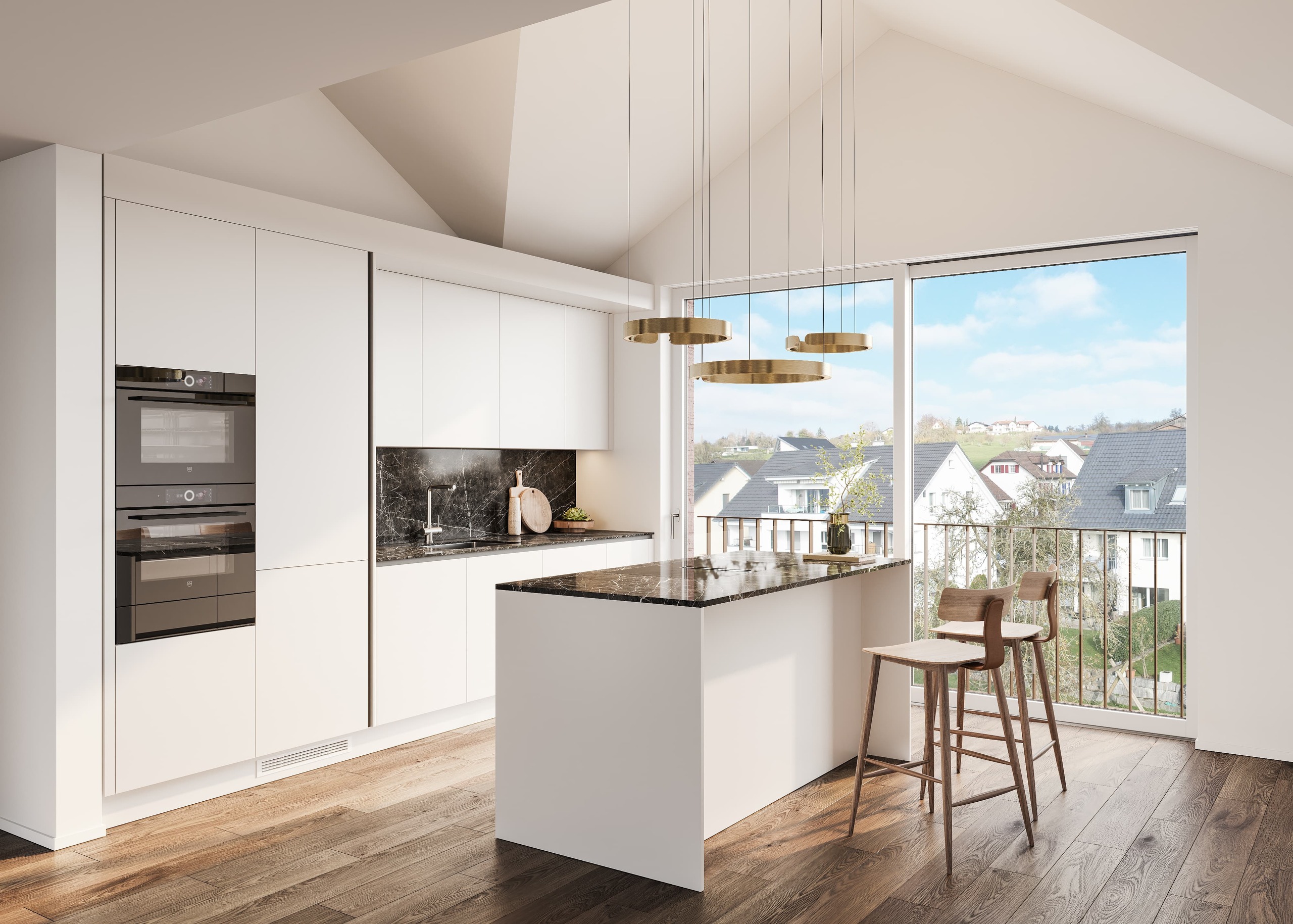 Moderne, offene Küche mit eleganter Kochinsel, hochwertiger Stein-Arbeitsfläche sowie zwei Backöfen und weiteren hochwertigen Geräten – ideal für Kochliebhaber und gesellige Abende.