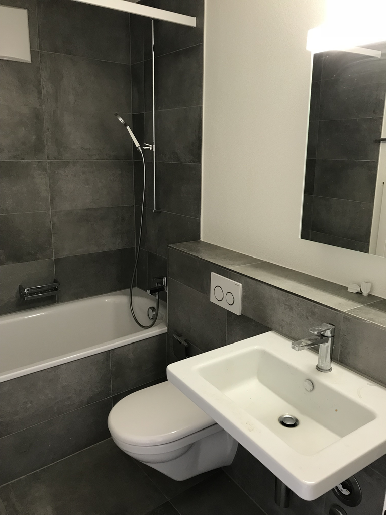 Renoviertes Badezimmer mit Badewanne und Plattenboden