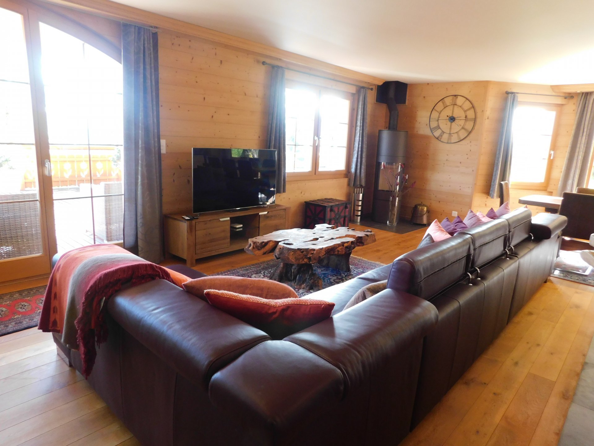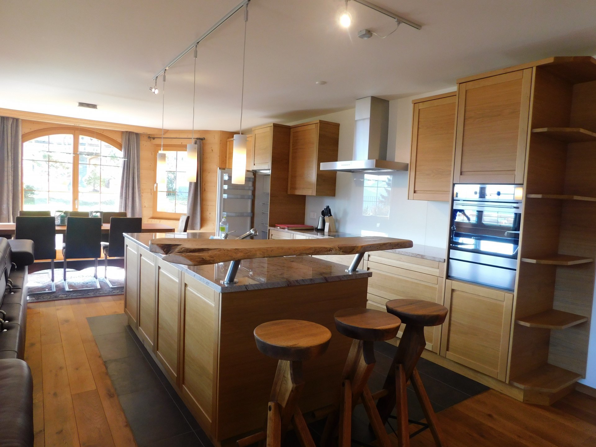 Cuisine entièrement équipée ouverte sur un vaste salon avec cheminée.