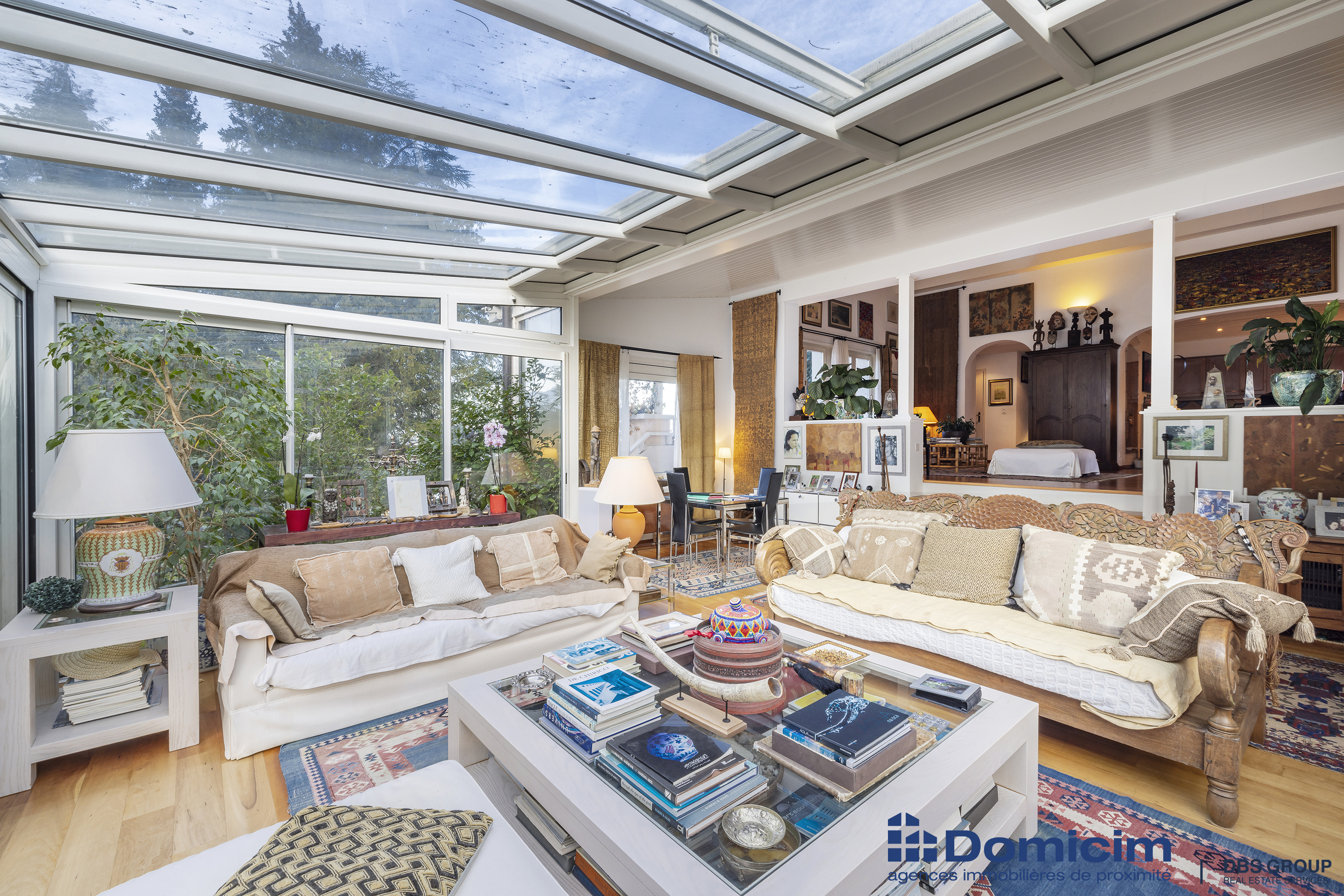 L’étage du rez-de-jardin se compose d’un hall d’entrée avec armoires, d’un WC visiteur, d’une cuisine ouverte équipée, d’un large séjour / salle à manger et d’un lumineux jardin d’hiver / petit coin de paradis.
