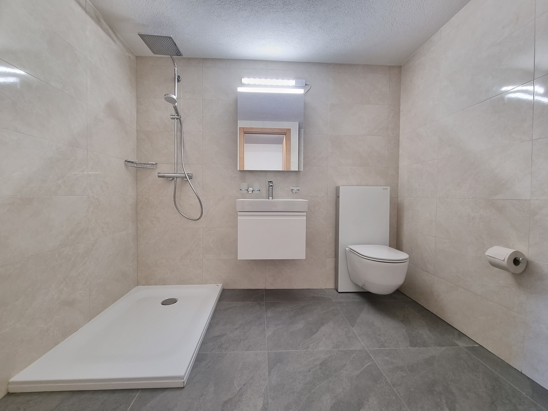 – Salle de douche avec grande douche, lavabo et WC